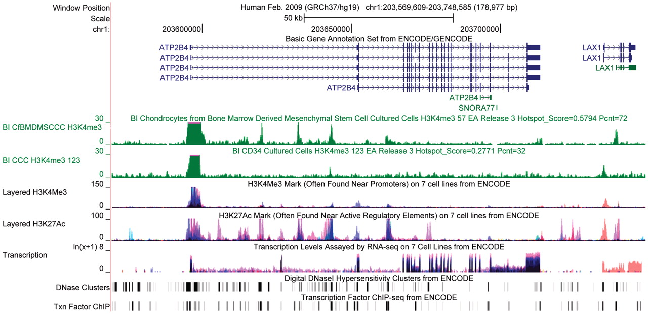 Example of genomic annotations (tracks) from the ENCODE consortium imported into the UCSC Genome Browser. From Rosenbloom et. al. (2011). "ENCODE whole-genome data in the UCSC genome browser: update 2012." Nucleic acids research. 40. D912-7. License: CC BY-NC 3.0